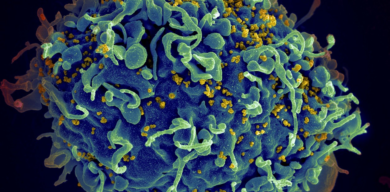 Micrografía electrónica de barrido en color de partículas de VIH (en amarillo) infectando una célula.Micrografía electrónica de barrido en color de partículas de VIH (en amarillo) infectando una célula.