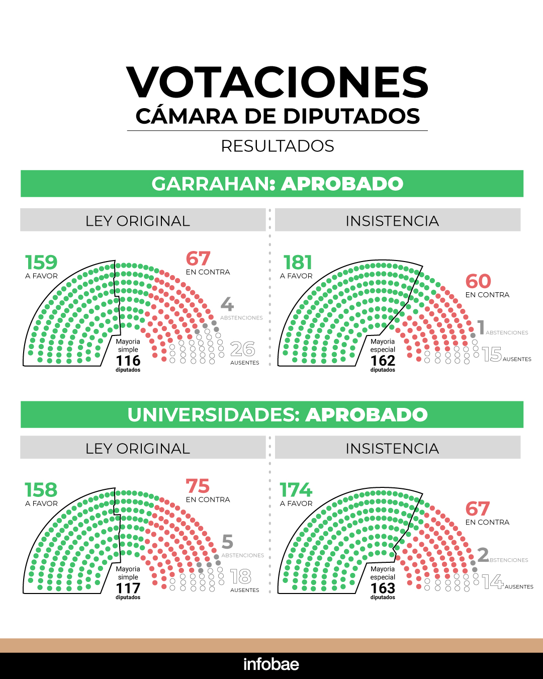 En tanto, la iniciativa universitaria fue sancionada por una amplia mayoría, con 174 votos afirmativos, 67 negativos y 2 abstenciones tras intensas negociaciones que incluyeron a bloques de Unión por la Patria, la UCR, Hacemos Coalición Federal, Innovación Federal y un sector de la Coalición Cívica.